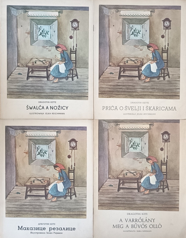 Slika 3: Za svoje prvo delo, osem ilustracij za delo Šivilja in škarjice (Dragotin Kette), ki je leta 1964 v različnih jezikovnih različicah sočasno izšlo pri več jugoslovanskih založbah, naj bi takrat še neuveljavljena ilustratorka Jelka Reichman prejela kar petkratnik takratne mesečne učiteljske plače. Zaščiteno z avtorskimi pravicami.