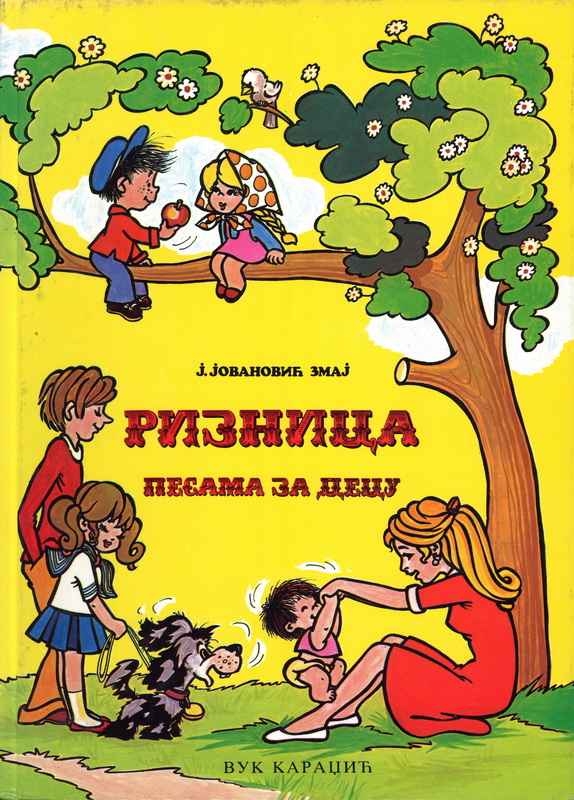 Slika 2: Tako je Vladana Likar-Smiljanić, ki je kot profesorica elektrotehnike ilustratorsko delo opravljala v prostem času, vanj včasih vključila tudi svoji hčerki in njun prijateljski krog otrok. V svojih delih je večinoma uporabljala črno obrobljene figure in ozadja, ki so jih otroci lahko pobarvali. Ilustracija Vladane Likar-Smiljanić za delo Riznica pesama za decu (Jovan Jovanović-Zmaj), Vuk Karadžić, Beograd, 1980. Zaščiteno z avtorskimi pravicami.