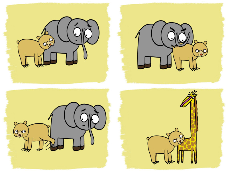 Slika 1: Naloga povezovanja stavka in slike. Udeleženec posluša zvočni posnetek stavka (primer: Medved grize slona) in izbere eno izmed štirih slik, ki stavku pomensko ustreza.