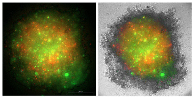 Slika 1: Tridimenzionalni sferoid, sestavljen iz kokulture glioblastomskih celic (zelena barva) in makrofagov (rdeča barva). Levo: Slika brez svetlobnega polja. Desno: Sferoid pod svetlobnim poljem.