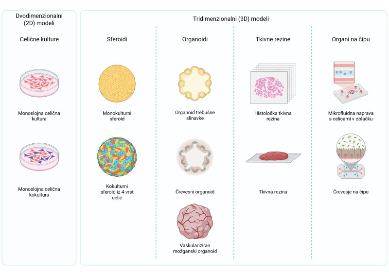 Slika 2: Shematski prikaz različnih vrst celičnih modelov. Ustvarjeno s programom BioRender.