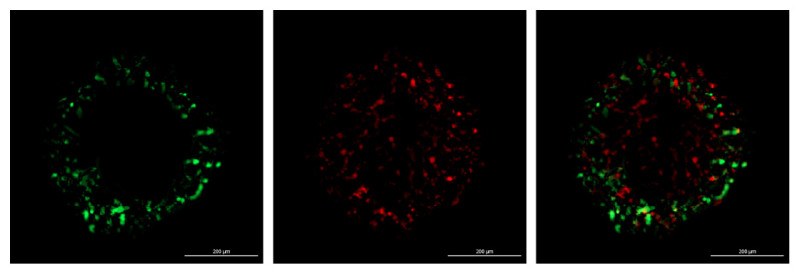 Slika 3: Tridimenzionalni sferoid, sestavljen iz kokulture glioblastomskih celic (levo, zelena barva) in makrofagov (sredina, rdeča barva). Desno: združena slika.