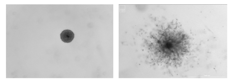 Slika 4: Sferoid pred začetkom invazije (levo) in med njo (desno)